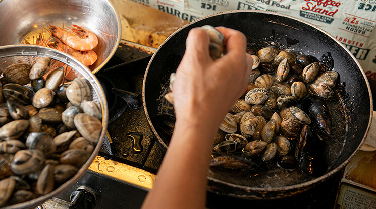 海老などの魚介にこぶ出汁、自家製ガーリックオイル、